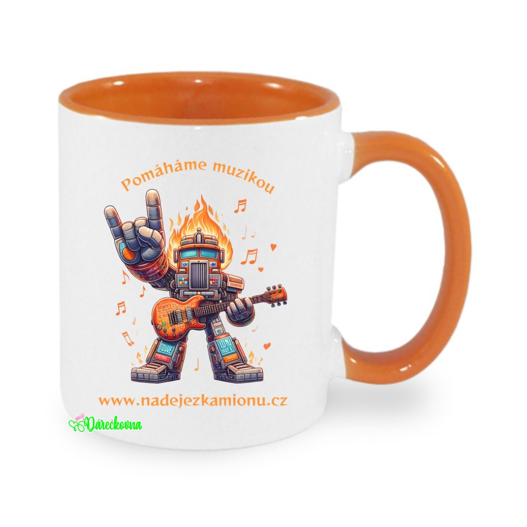Začněte svůj den stylově s charitativním hrnkem, který podpoří dobrou věc! Tento keramický hrnek ve třech barevných provedeních je ozdoben výrazným motivem robota. Robot hraje na elektrickou kytaru, je obklopen plameny, hudebními notami a srdíčky. Nápis „Pomáháme muzikou“ zdůrazňuje poslání projektu "Naděje z kamionu", na který nákupem tohoto hrnku přispíváte.