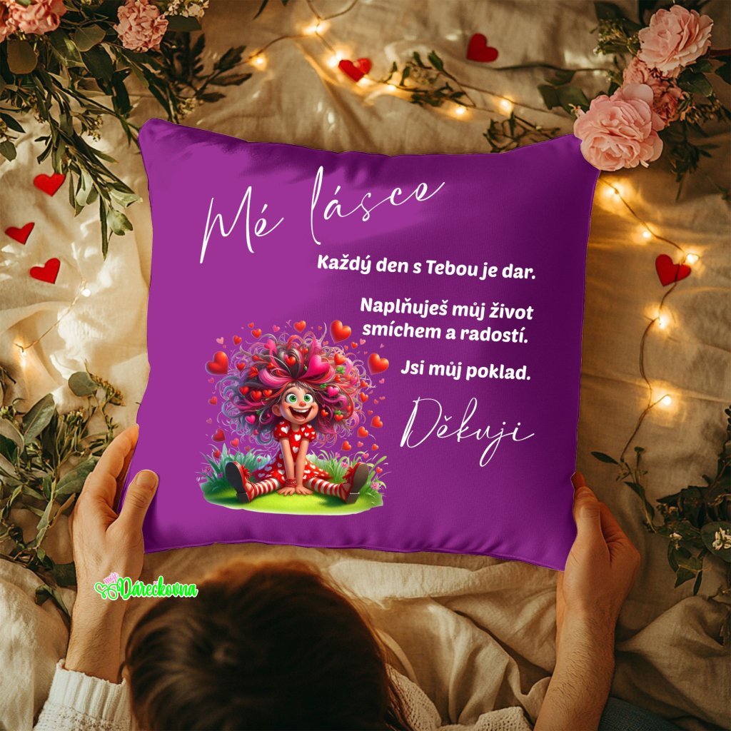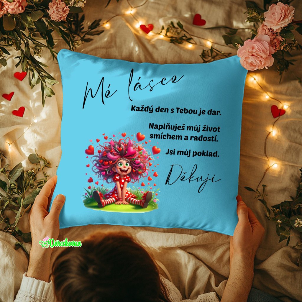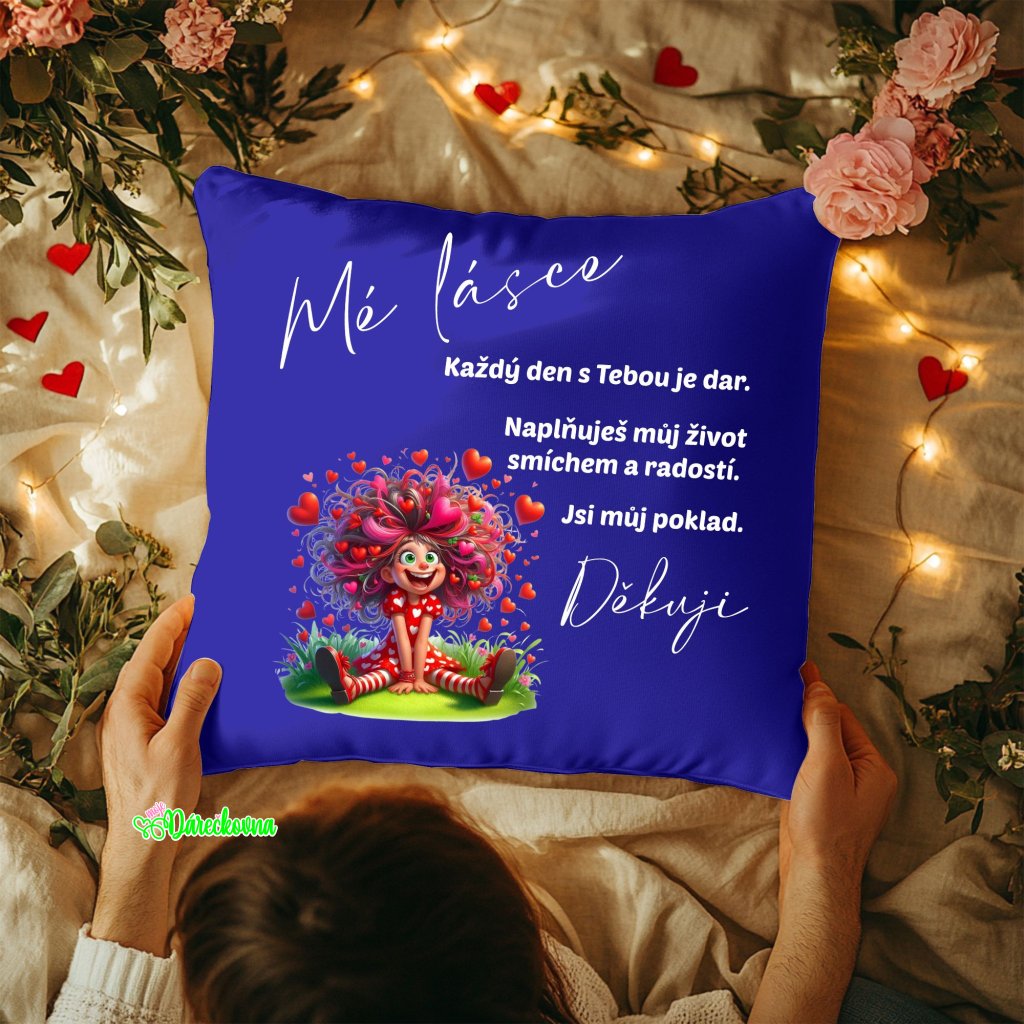 Hledáte dárek, který skutečně vyjádří Vaše city? Tento polštářek je dokonalým spojením emocí, designu a praktičnosti. Na polštáři dominuje romantický nápis „Mé lásce“ a něžná slova, která podtrhují význam společného vztahu. Obrázek rozesmáté postavičky obklopené srdíčky dodává polštáři špetku hravosti a radosti.