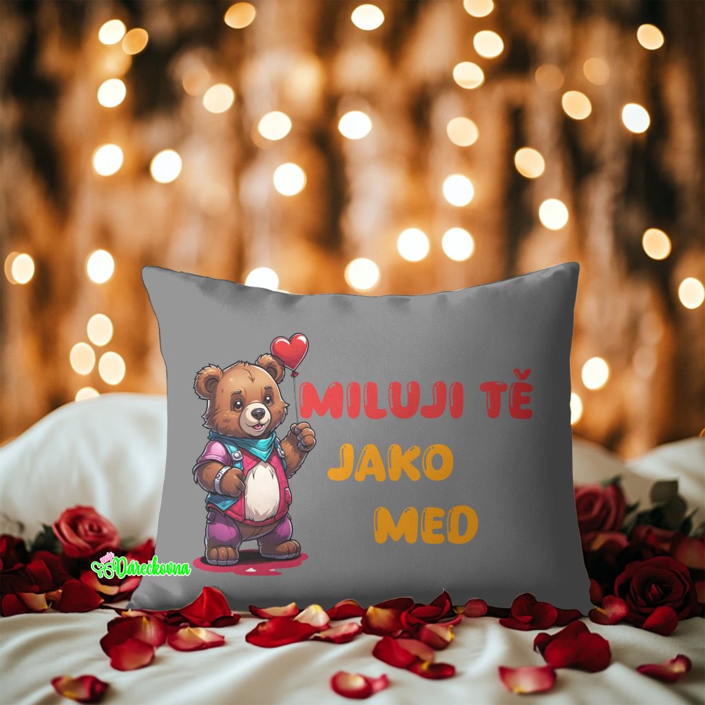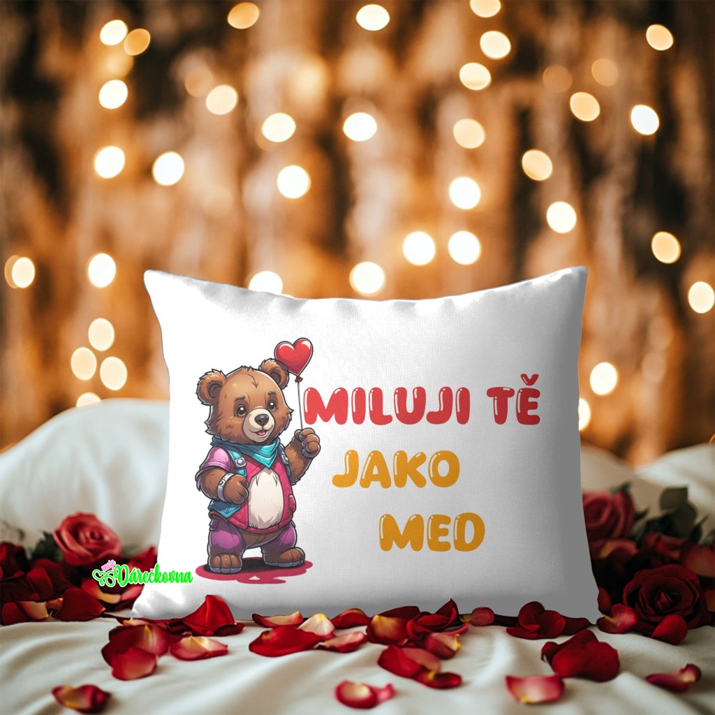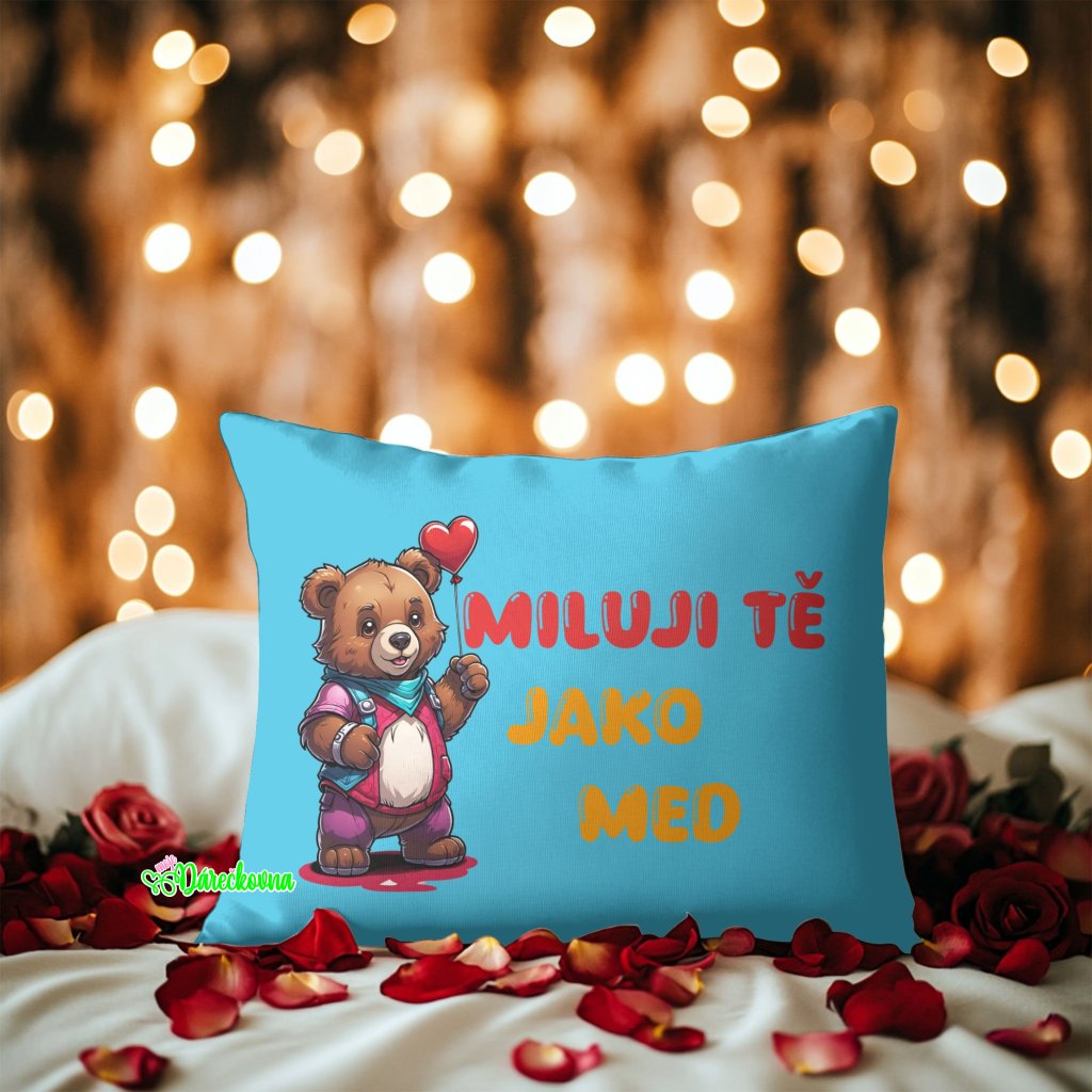 Tento polštář je jako stvořený pro milovníky roztomilých a originálních dárků! Na polštáři je vyobrazen usměvavý medvídek s balónkem ve tvaru srdce a text „Miluji tě jako med.“ Ideální dárek pro partnera, dítě nebo blízkého, kterému chcete vykouzlit úsměv na tváři.