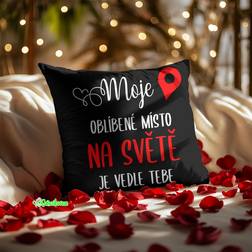 Tento polštář je dokonalým vyjádřením Vašich citů! Černý polštář s červeným a bílým nápisem „Moje oblíbené místo na světě je vedle tebe“ zaujme na první pohled. Ideální jako dárek pro Vašeho miláčka k Valentýnu, výročí nebo narozeninám.