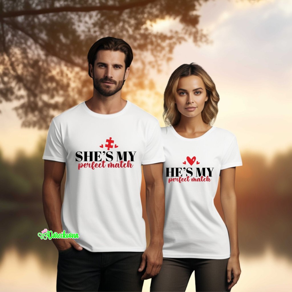 Vyjádřete své propojení stylově a originálně s touto sadou párových triček, která nesou jasné poselství – jste si souzeni. „He's My Perfect Match“ a „She's My Perfect Match“ jsou dokonalým způsobem, jak oslavit Vaši lásku a připomenout si, že jste jako kousky skládačky, které do sebe perfektně zapadají.