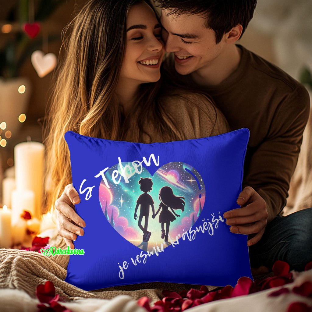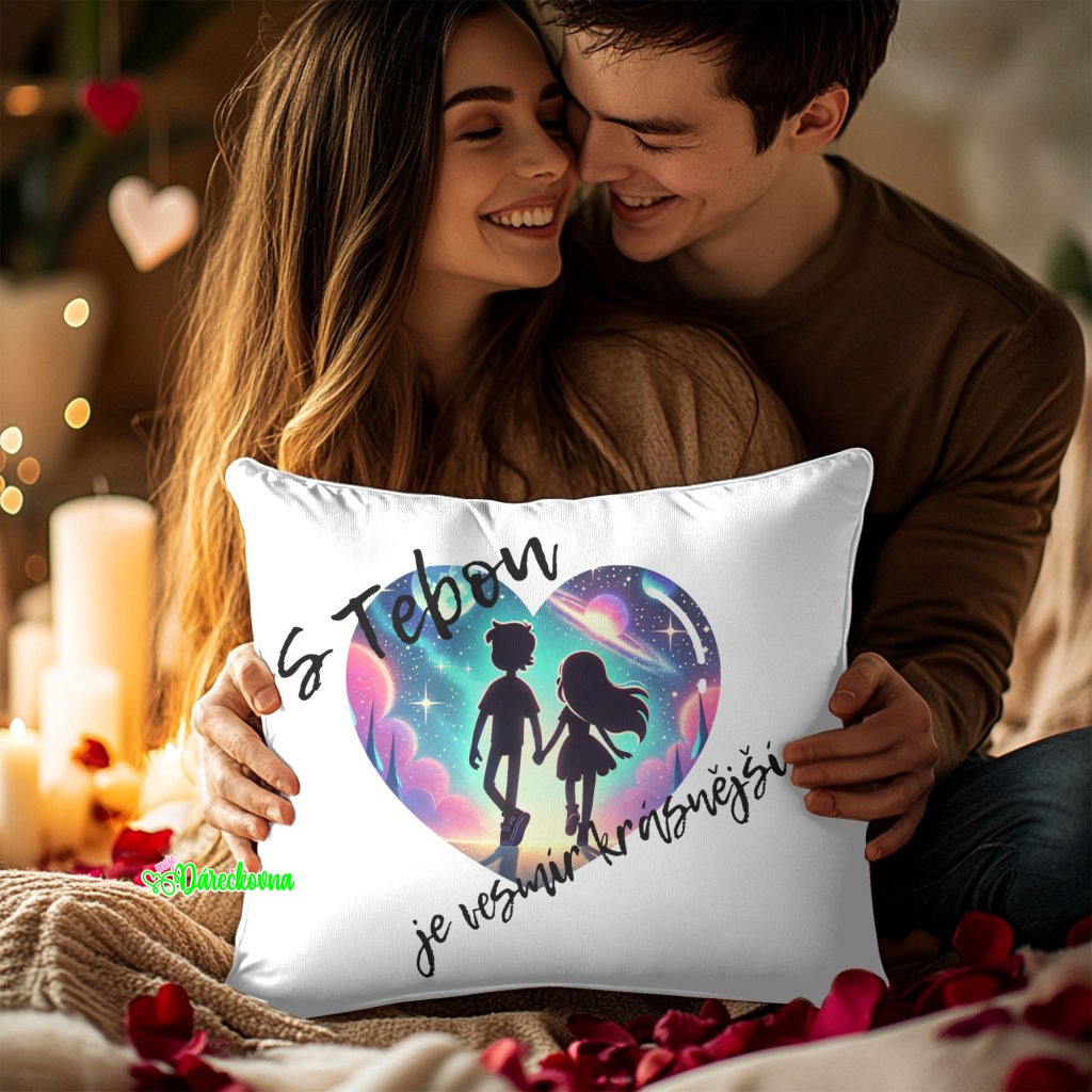 Romantický polštář s motivem vesmíru a siluetou páru v srdci je perfektním dárkem pro Vaši drahou polovičku. Nápis „S Tebou je vesmír krásnější“ vyjadřuje, že právě díky lásce je svět kolem nás výjimečný. Ideální na Valentýna, výročí nebo jen tak z lásky.